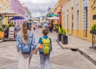 A blonde mother and child walk down the streets of San Cristobal, Chiapas.