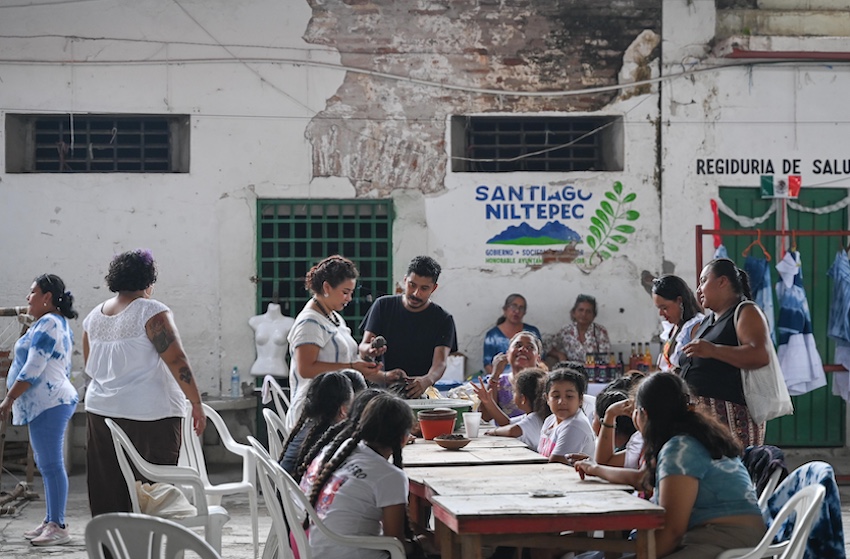 Walking though the center of Santiago Niltepec, you see women dressed in traditional clothing, a huipil and falda (skirt and blouse). But unlike the typical embroidered textiles from neighboring towns, the fabric of these huipils and faldas have been dyed a beautiful blue patterned with the shibori method, illustrating a fusion of historical practices with new traditions.