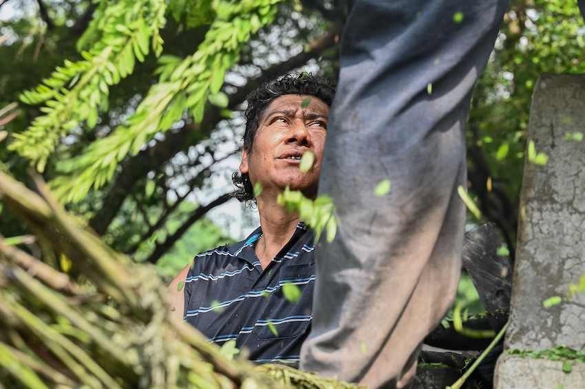 The harvesting of jicalite is done in the cooler hours before dawn. They are bound, cut with a scythe and loaded into ox-drawn carts. These carts can pass through the mud, unpassable by car following the intense rains in the region.