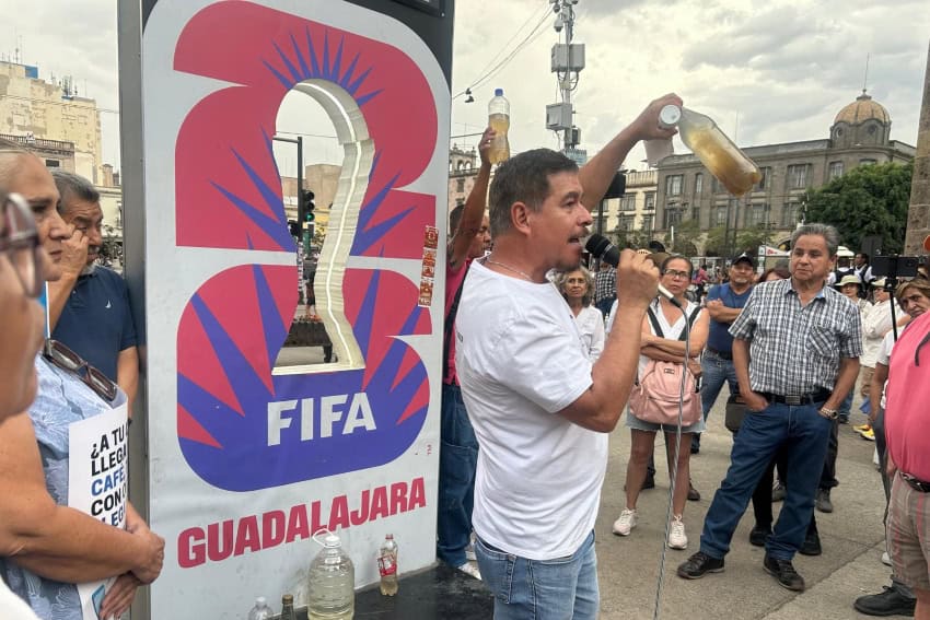 The removal of Sistema Intermunicipal de los Servicios de Agua (SIAPA) director Antonio Juárez Trueba came on the heels of an animated protest in the historic center, where hundreds of participants gathered on Sunday beside the city’s official World Cup countdown clock and chanted “Más agua, menos Mundial (More water, less World Cup). Some hoisted cutouts of Trueba’s face and called for his firing, battered a piñata of Gov. Pablo Lemus and lined up to have their water tested by a citizen water monitoring group.