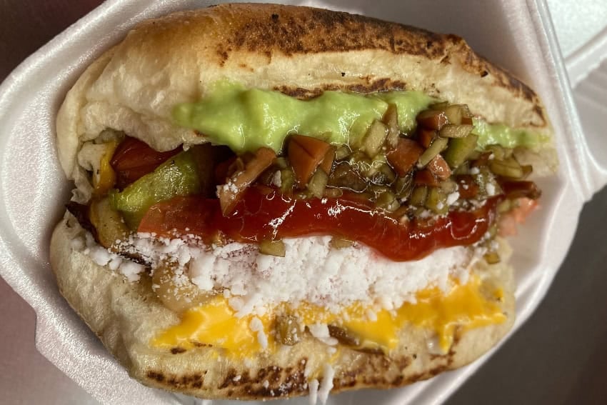 Here’s what that looks like today: bacon-hugged “weenie” that gets sliced down the middle and filled with a stick of cheese, then grilled and inserted into a larger-than-usual bolillo-style bun to be topped with diced tomatoes, avocado, onions (both raw and grilled), pinto beans, lettuce, chorizo and other traditional and unorthodox condiments, from mayonnaise and ketchup to jalapeños and güero peppers. If it isn’t vividly clear, these greasy “dogos” are easily customizable and typically well-laden to the brim (there are double sausage, flour tortilla, and shrimp variations, too).