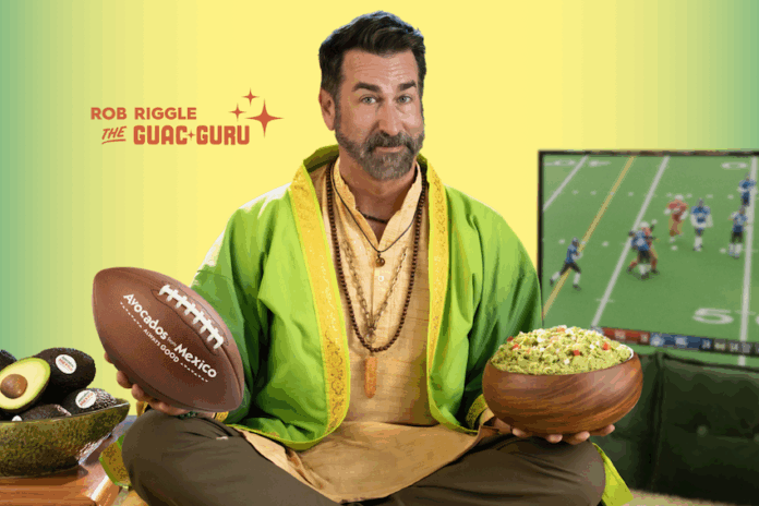 The web-based experience features an AI avatar modeled after comedian Rob Riggle, playing “Guac Guru” to offer live football predictions.