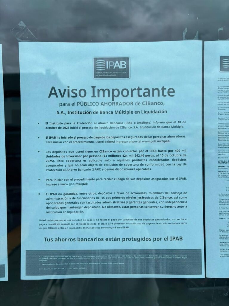 Deposits at CIBanco are protected by the IPAB for up to 400,000 Investment Units (UDIs) per person, equivalent to $3,424,262.40 pesos as of Friday.
