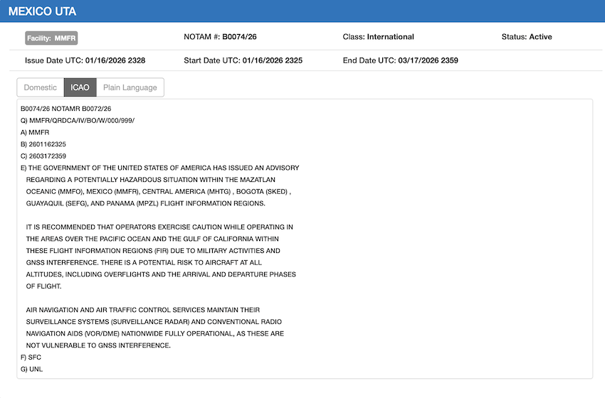 “U.S. operators are advised to exercise caution when operating in the overwater areas above the Pacific Ocean and the Gulf of California in the Mexico Flight Information Region (MMFR) due to military activities and GNSS interference. Potential risks exist for aircraft at all altitudes, including during overflight and the arrival and departure phases of flight,” states NOTAM A0018/26.