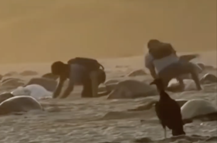 The footage, shared widely on social media, shows several young men with white sacks extracting eggs directly from nests in the sand and handling turtles during nesting — with one person seen grabbing and throwing a turtle.