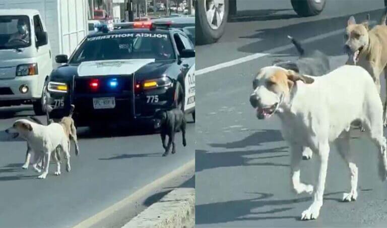 In a video shared by Monterrey police on Twitter, a transit police vehicle with sirens on is seen driving down the left-hand lane of a busy three-lane highway. Just in front of it are four apparently stray dogs not wearing collars and running in a pack.