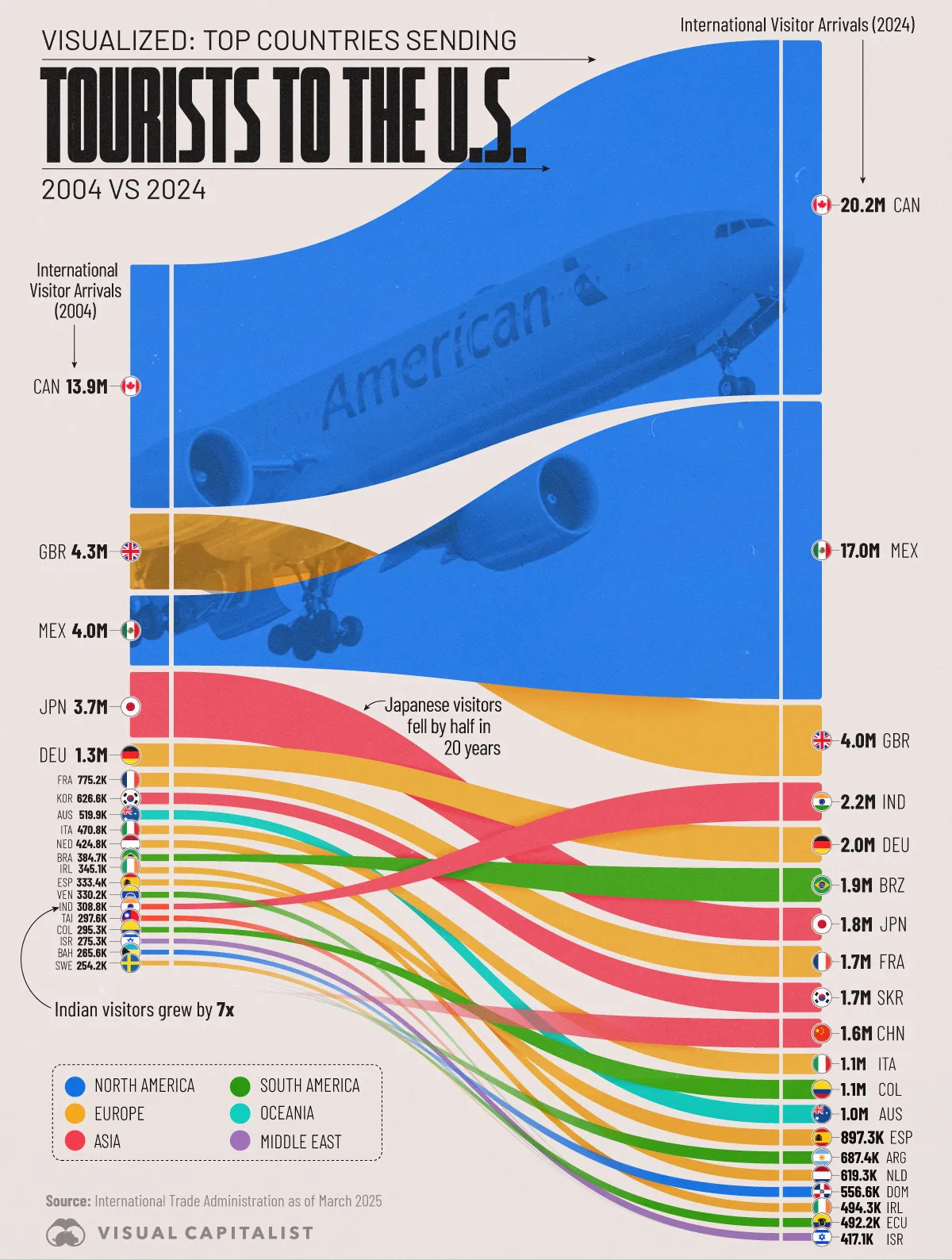 Tourists from Mexico to the United States have more than quadrupled in the past two decades. On the other hand, Mexico is the United States’ top international flight destination. Roughly 45 million passengers fly between the two countries every year. That’s about 1.6x Canada, the second-largest destination, and roughly five times Japan, which ranks fifth. While tourism often looks like a “deficit” on paper, it’s also a massive welfare gain for Americans: world-class beaches in Cancún, Cabo, Vallarta and Tulum; food, arts and culture in Mexico City and Oaxaca; and historic towns like San Miguel de Allende, Querétaro and Guanajuato.