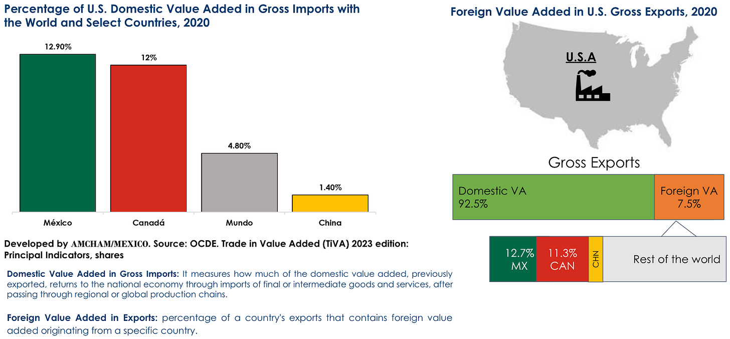 This is precisely what happens between the United States and Mexico. Mexico has the highest share of U.S. components embedded in its exports — roughly 10 times more American content than Chinese exports and nearly three times the global average. And it works the other way too: among all foreign value added in U.S. exports, Mexico ranks first, accounting for about 13%.