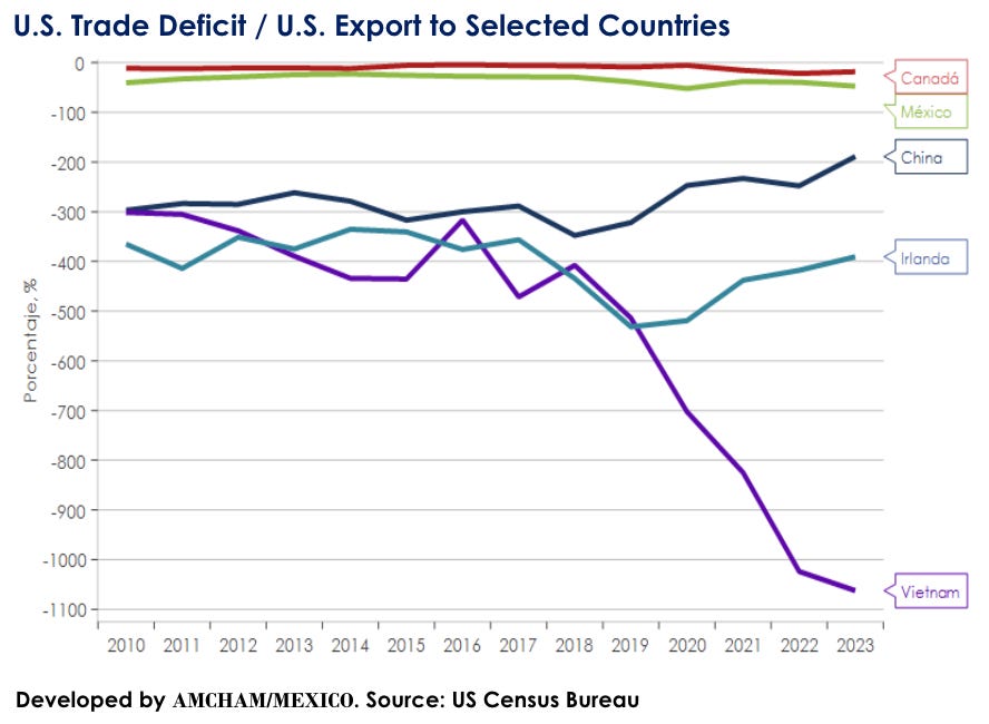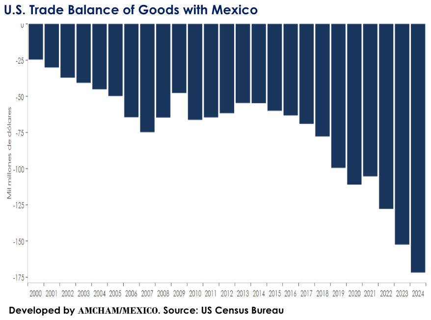 Over the past decade — especially the last eight years — the U.S.-Mexico trade relationship has intensified like never before. As most of you already know, Mexico and the United States are now each other’s top trading partners, both in exports and imports. Mexico is the largest buyer and seller for the U.S., and vice versa. But given the difference in economic size — roughly 16 to 1 (U.S.: ~$30 trillion vs. Mexico: ~$1.86 trillion) — and Mexico’s export-oriented model, Mexico naturally exports more than it imports. That dynamic has deepened Mexico’s trade surplus with the United States.