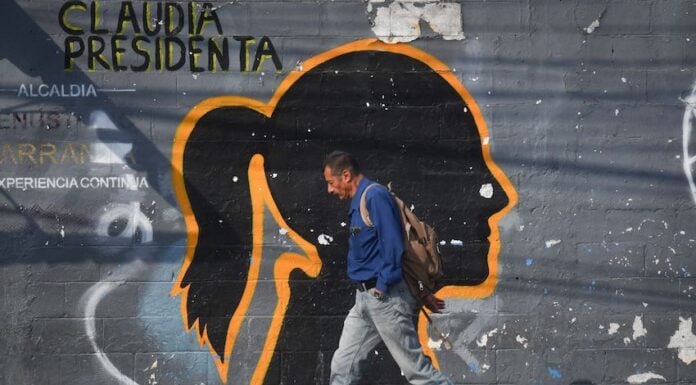 A man walks in front of a faded mural of the silhouette of President Claudia Sheinbaum, on Emiliano Zapata Street in Mexico City.