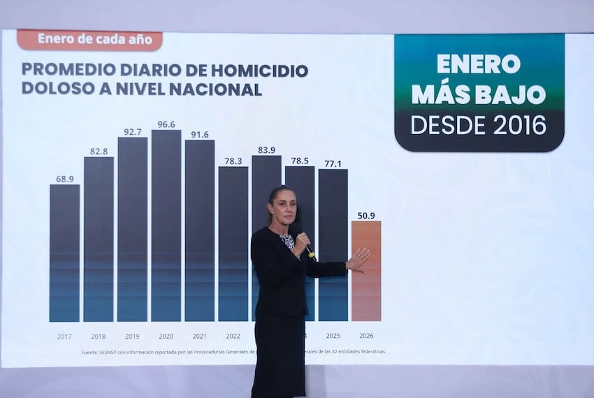 National Public Security System chief Marcela Figueroa told reporters that the daily homicide rate in Mexico in January was the lowest of any month in the past 17 months — i.e., since September 2024, the final month of Andrés Manuel López Obrador’s presidency.